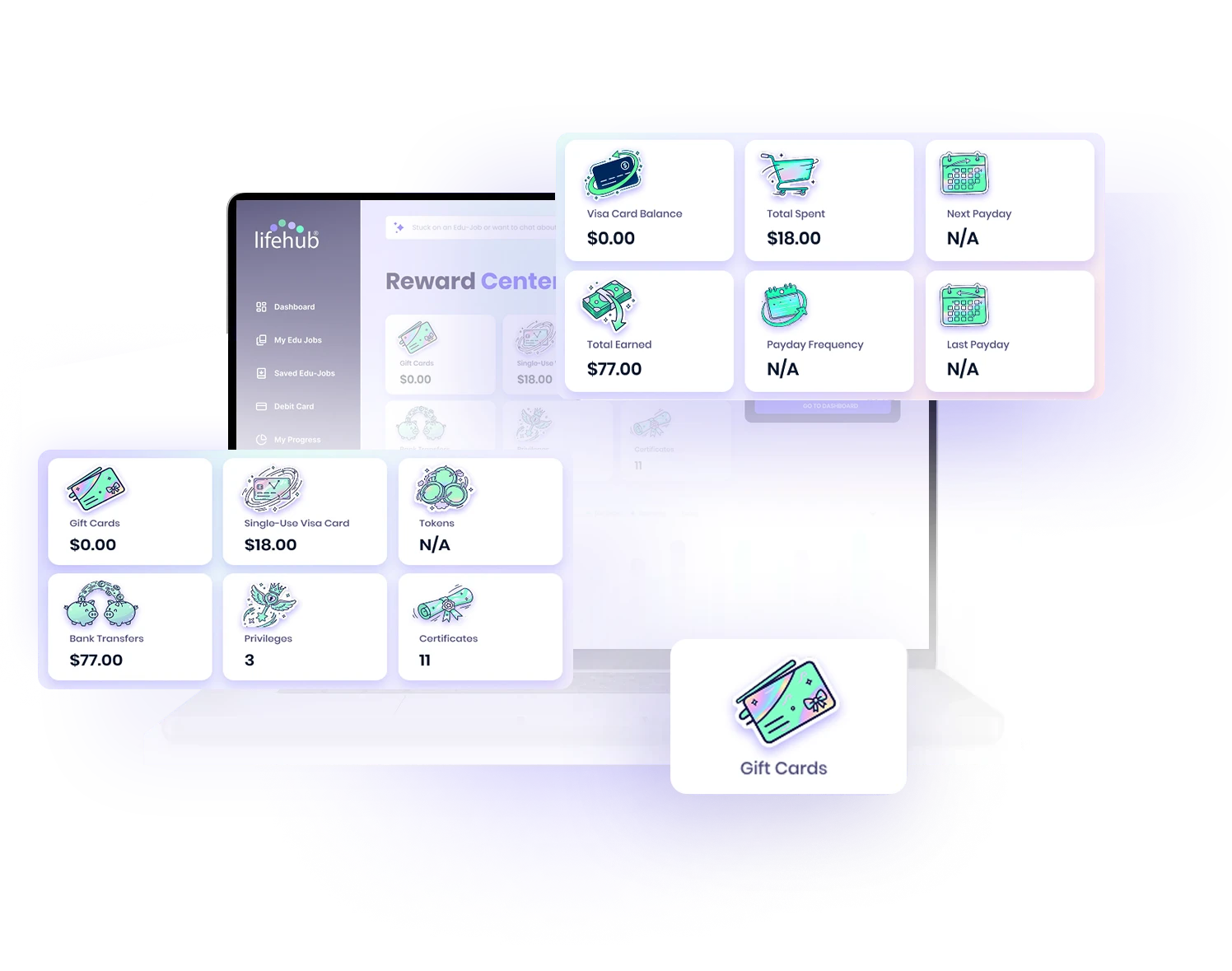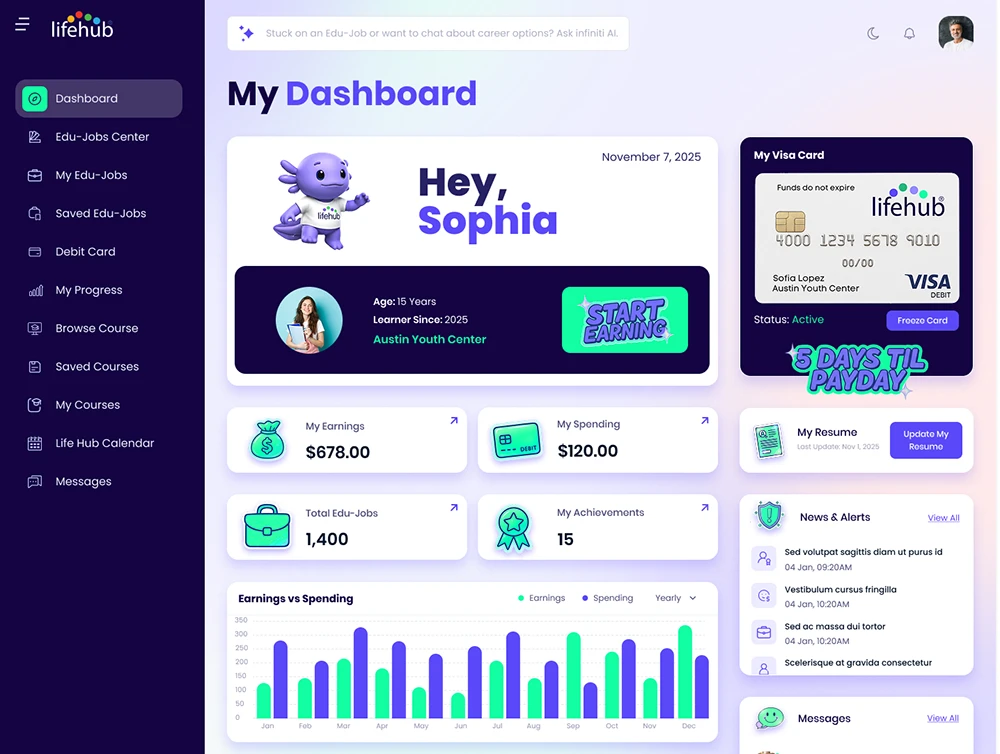 Life Hub® delivers a uniquely complete real-world monitized learning experience for practical money management. Connecting effort and performance to real rewards, the knowledge, skills and behaviors kids build pays them real cash earnings, paid weekly, bi-monthly or monthly on their Life Hub® Visa® Rewards Card. That's money they can save, spend, invest and donate in the real-world.