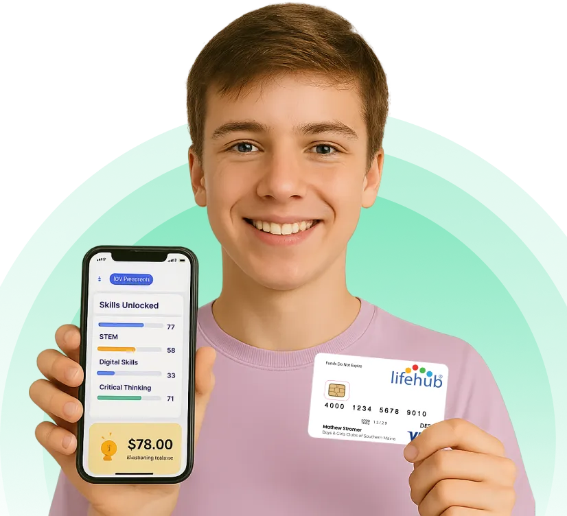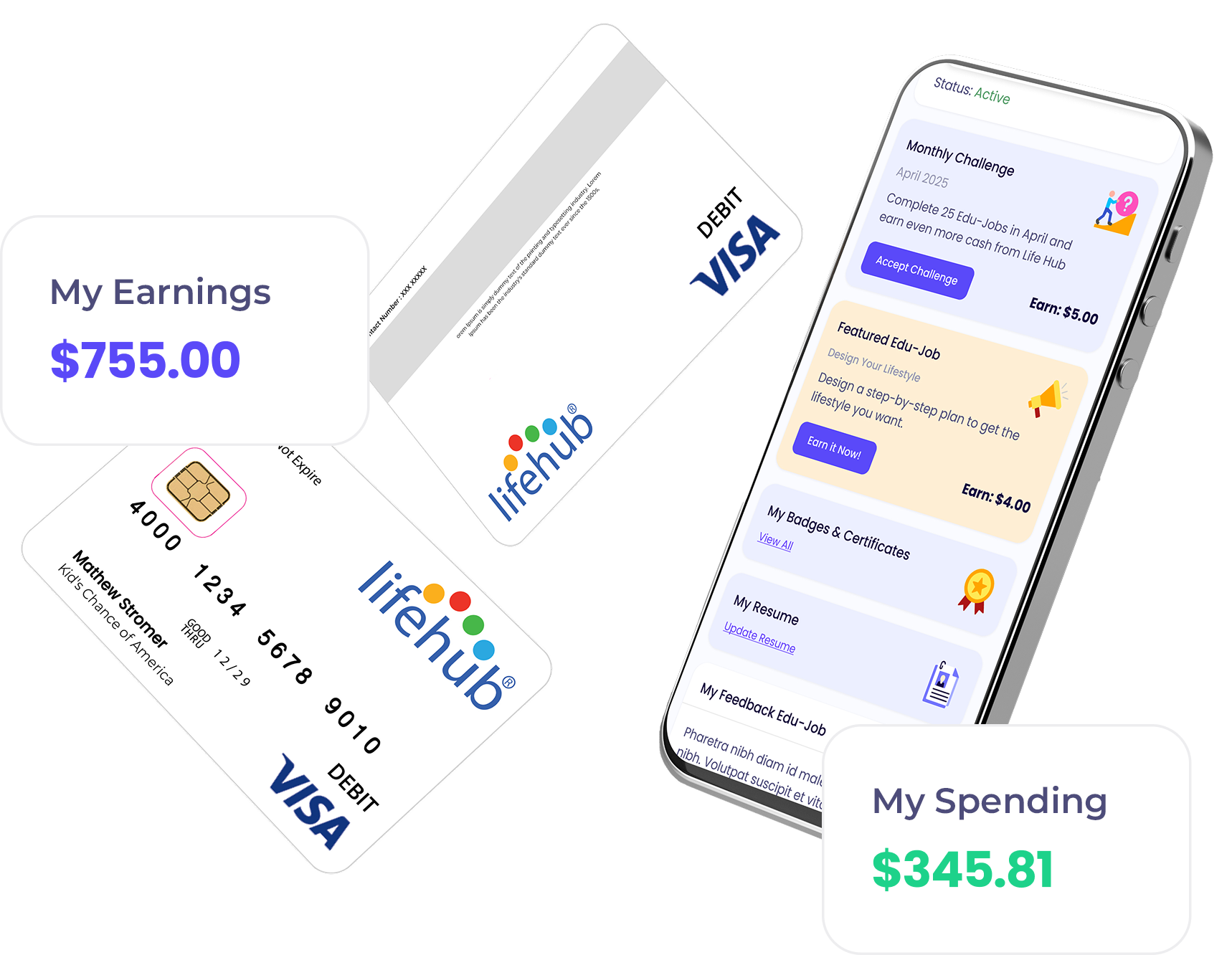 Life Hub® delivers a complete real-world learning experience with banking-style tools for practical money management with Life Hub® Visa® rewards card.