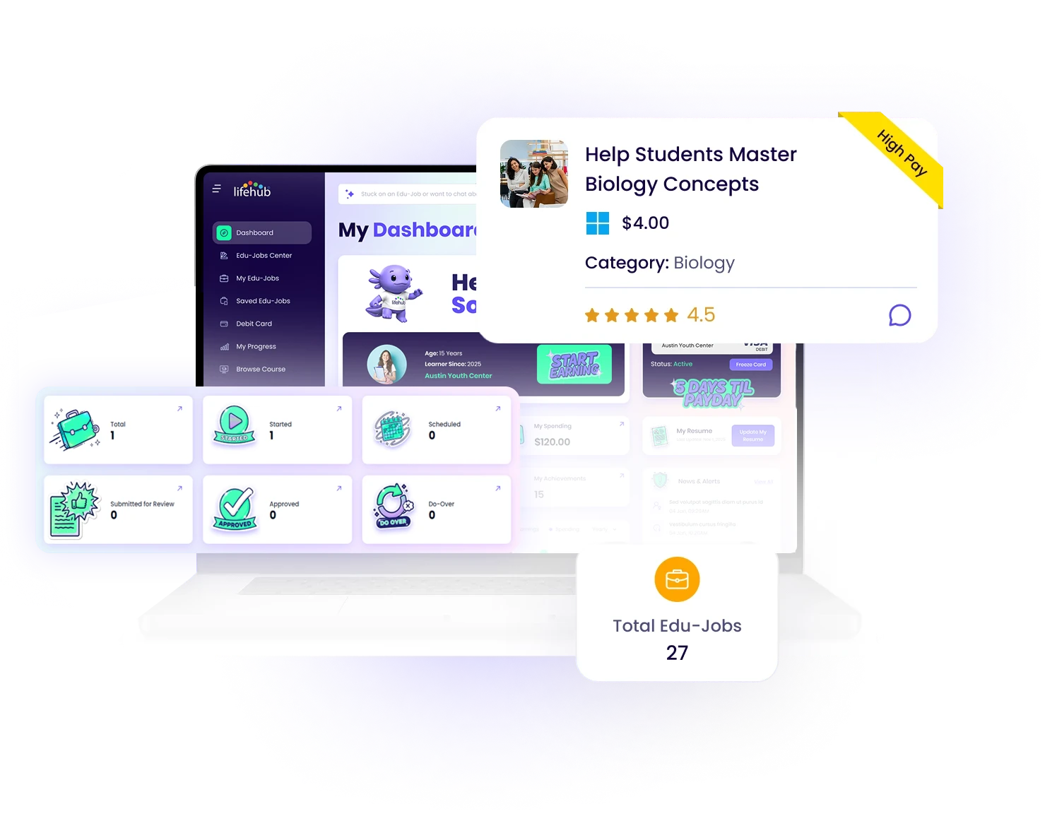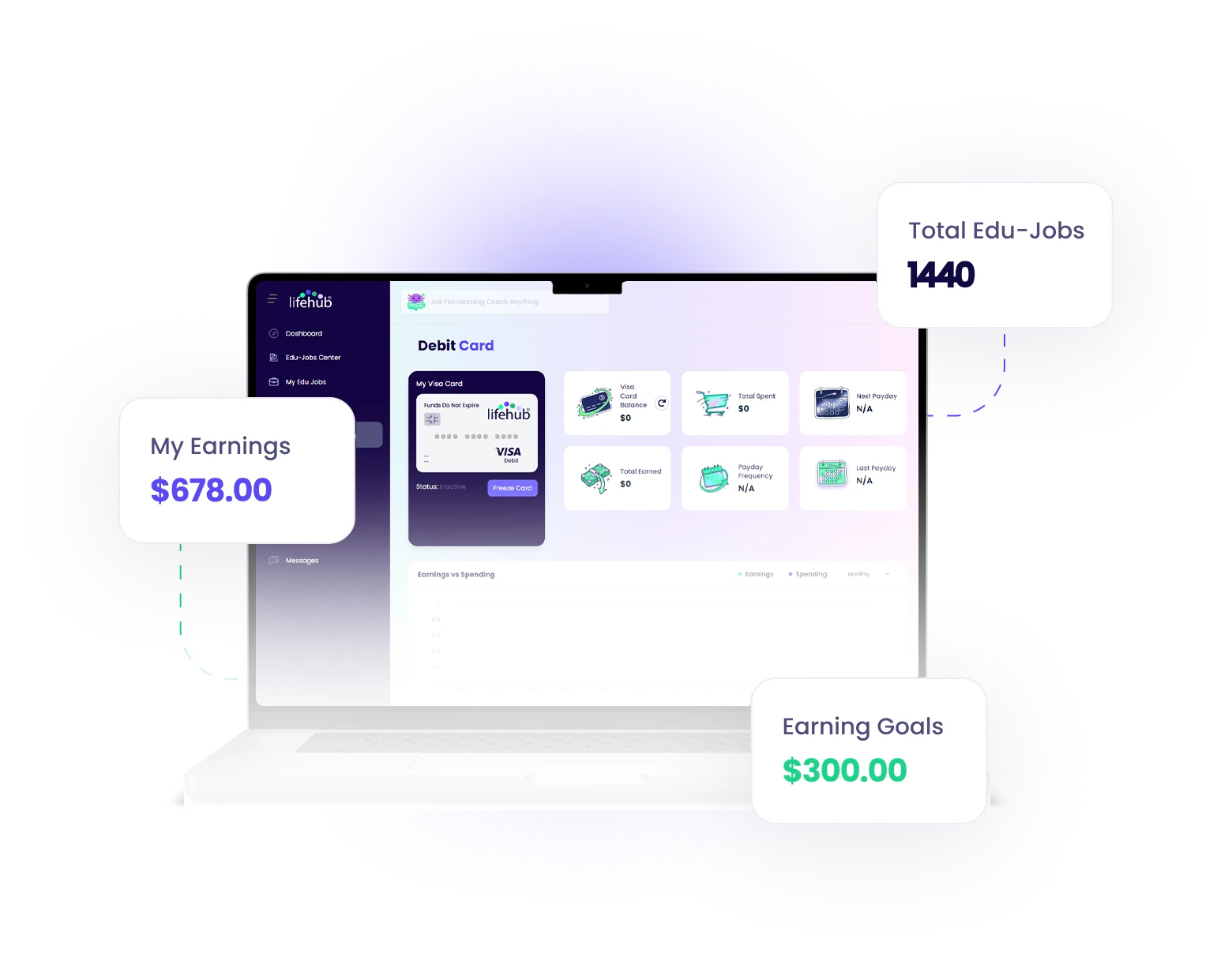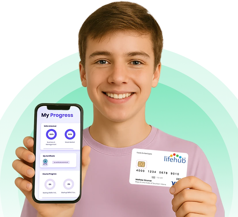 Life Hub® delivers a complete real-world learning experience with banking-style tools for practical money management. Connecting effort to reward, each topic they master builds real cash earnings, paid weekly onto their own Life Hub® Visa® Rewards Card. All while building confidence, purpose and skills. And - opening doors to careers that transform what they love into how they live.