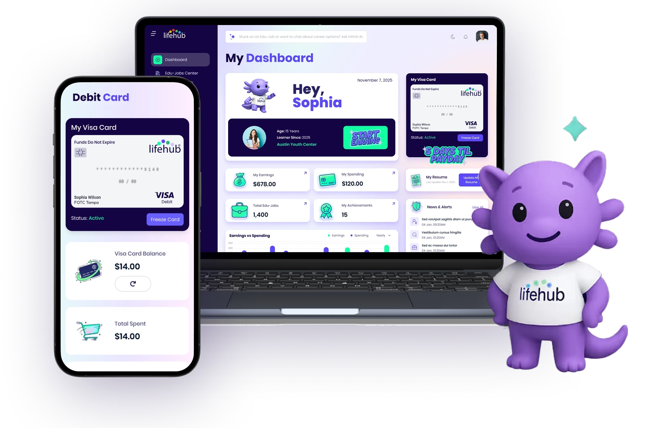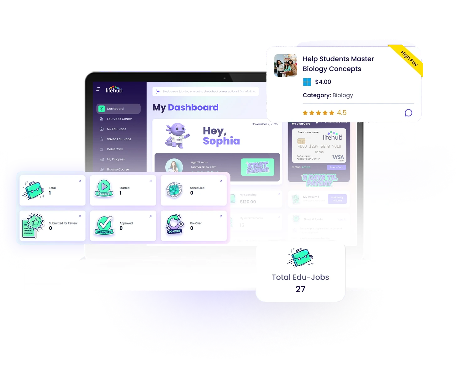 Life Hub® delivers a uniquely complete real-world monitized learning experience for practical money management. Connecting effort and performance to real rewards, the knowledge, skills and behaviors kids build pays them real cash earnings, paid weekly, bi-monthly or monthly on their Life Hub® Visa® Rewards Card. That's money they can save, spend, invest and donate in the real-world.