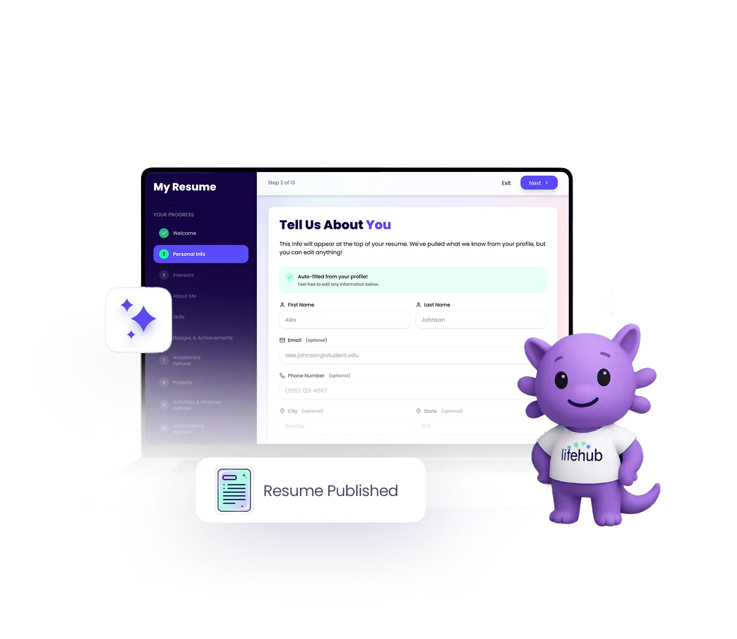 Life Hub Resume empowers kids to capture their unique narrative, goals and achievements, building a personalized record of their growth on Life Hub, school & the real-world.