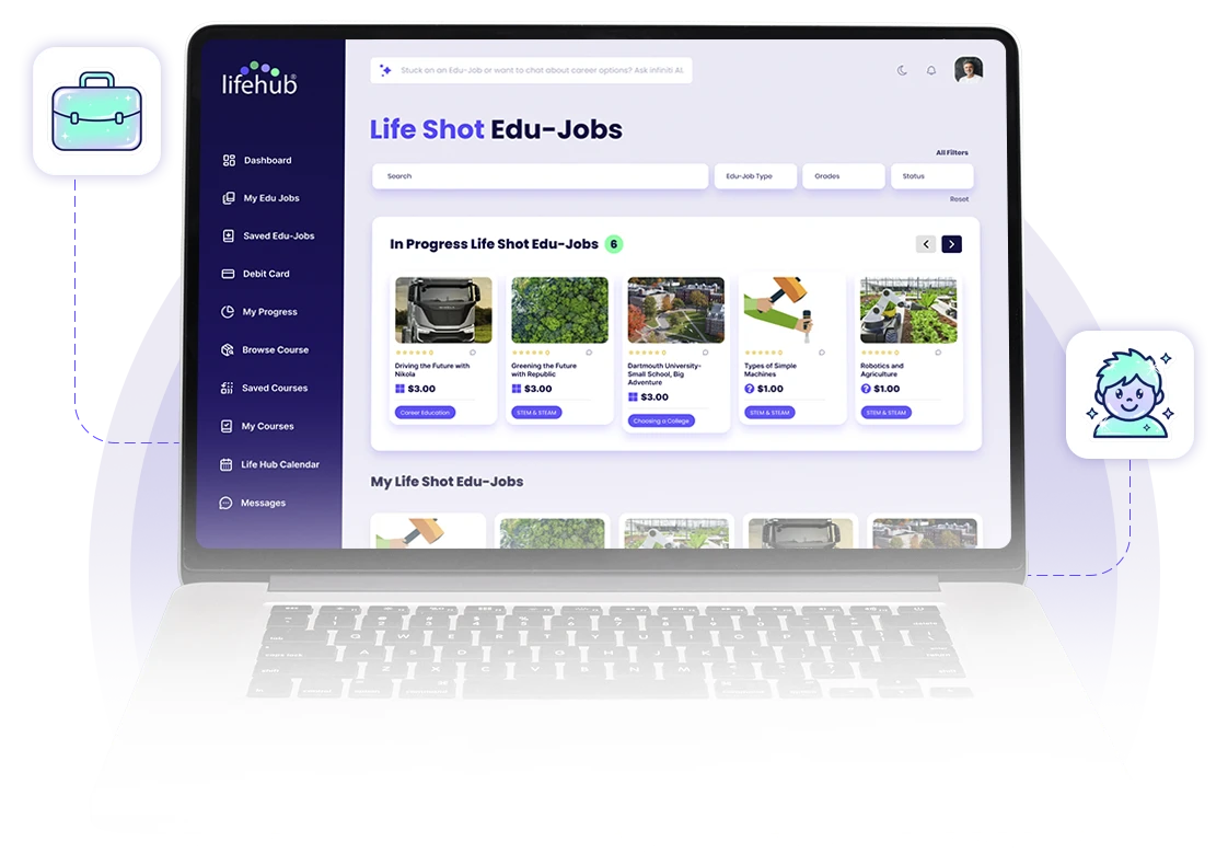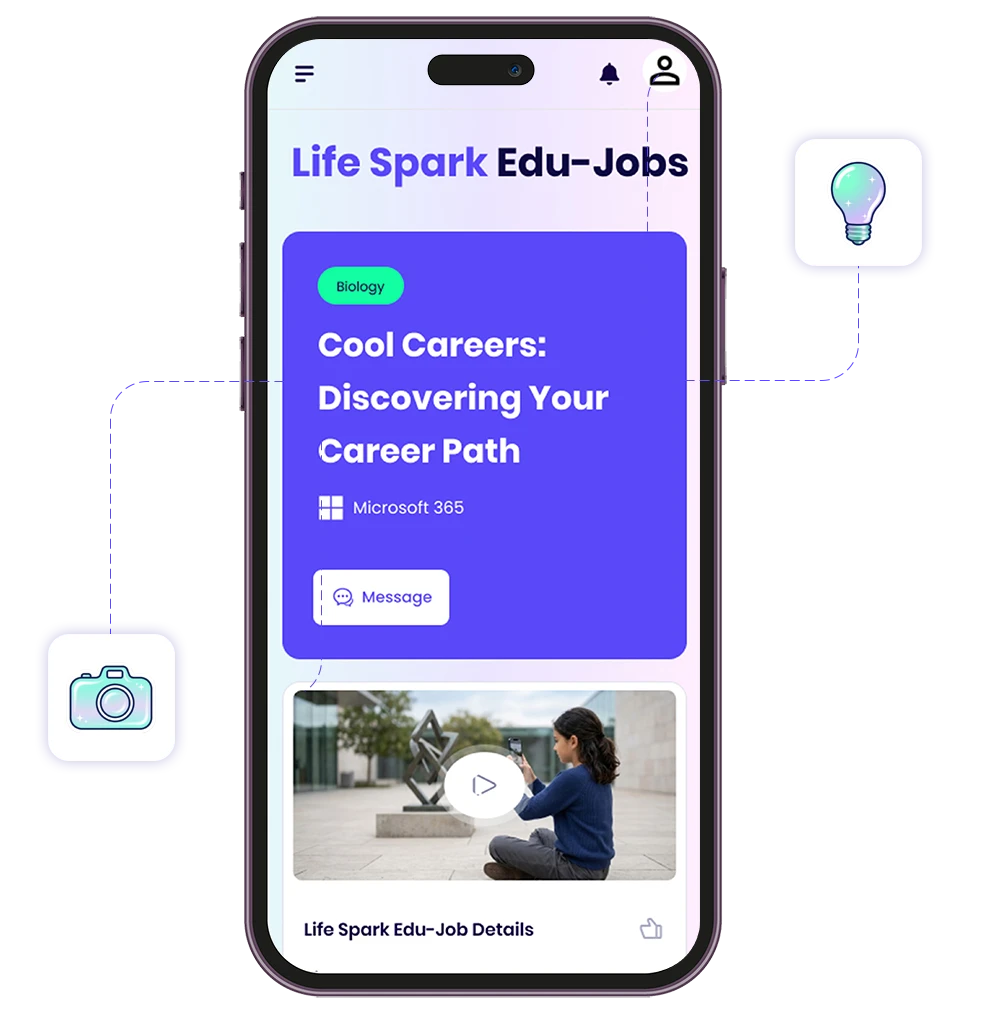 Kids build a professional Resume, master a quick Life Shot, spark curiosity to learn with photo-based AI-assisted Edu-Jobs with Life Spark, and chart My Dream Life journey.