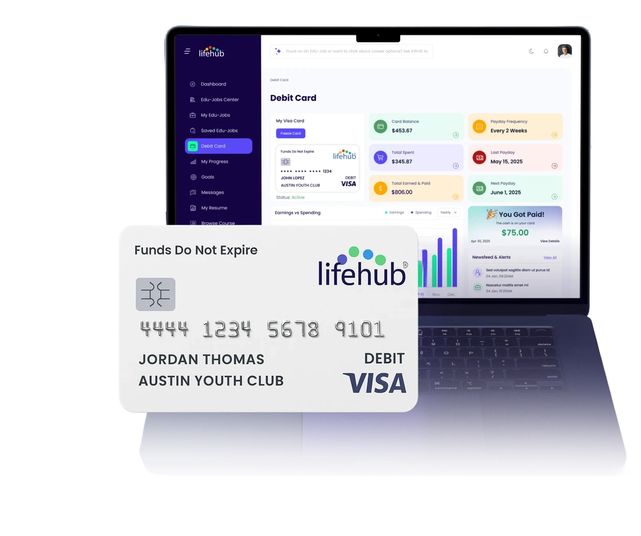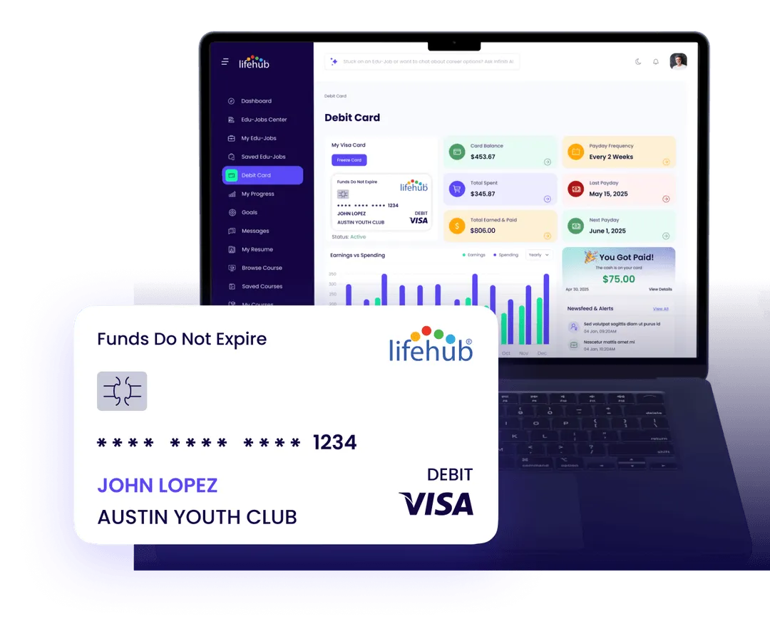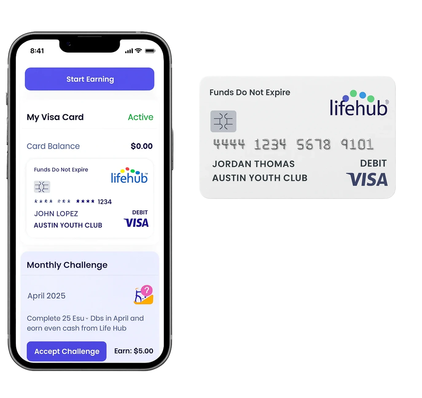Life Hub® Visa® rewards card works just like a traditional bank debit card - and with banking-style experiences and a simple dashboard, earnings, savings & spending are easily monitored & tracked by kids and parents.