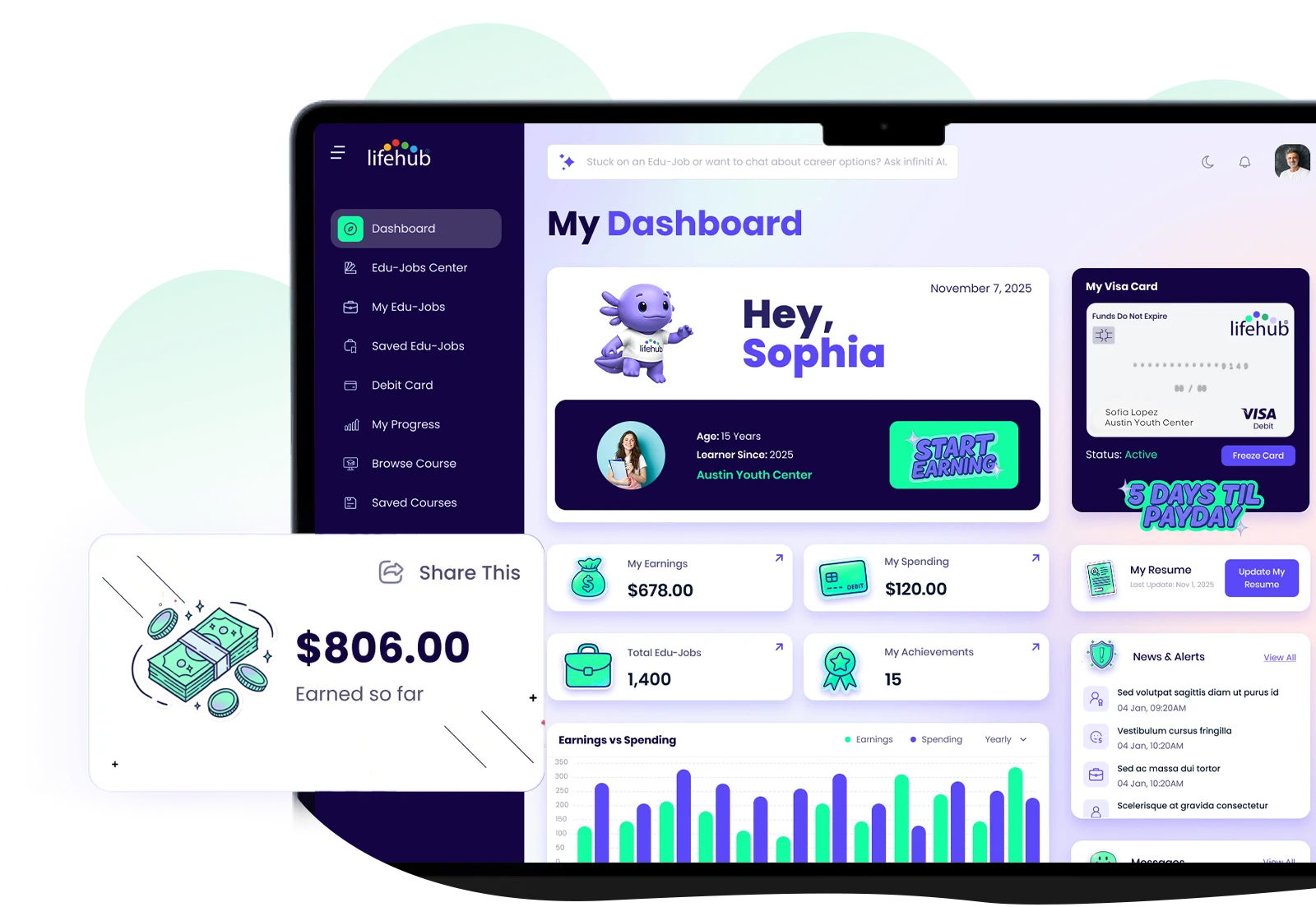 Dashboard with fun and celebratory ""You Got Paid!" visual notification for earnings received on the Life Hub® Visa® rewards card - as weekly, bi-monthly or monthly paydays.